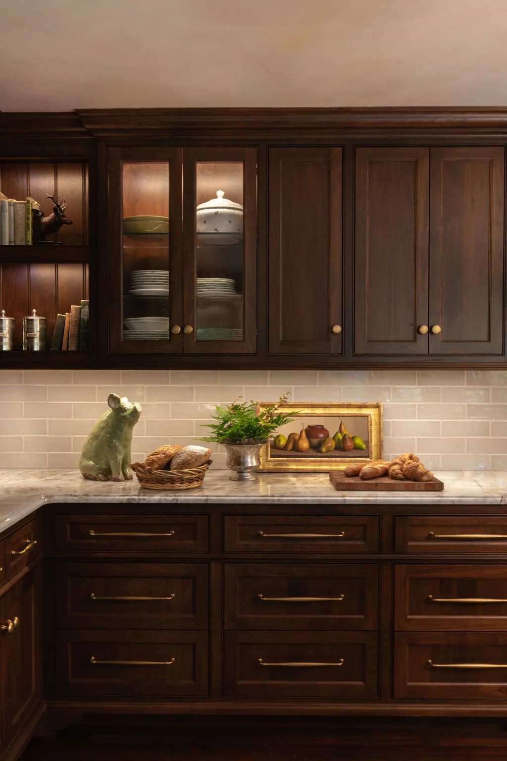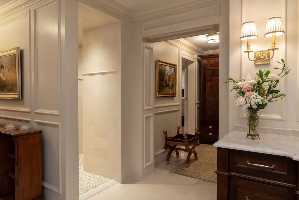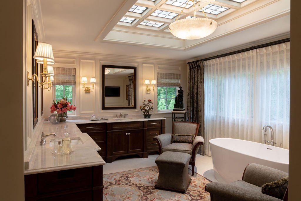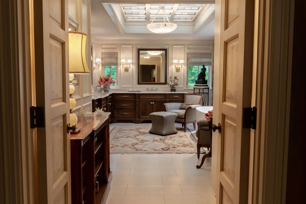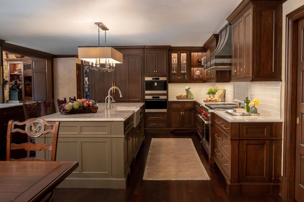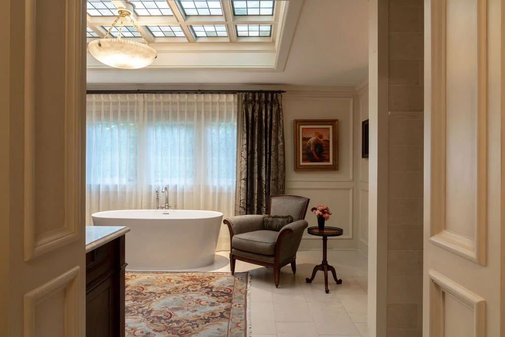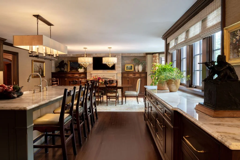 In testament to Bruce Kading's belief that “a great home is never finished,” we’ve been working with our clients since 1995 to transform this former split-level house into an authentic Normandy Tudor-style home with lush gardens, and a swimming pool and pool house. Our clients enjoy collaborating with us to keep the house fresh, so we recently redesigned the kitchen with new cabinetry and expanded the dining area, refreshed the dining room and updated the primary bathroom.